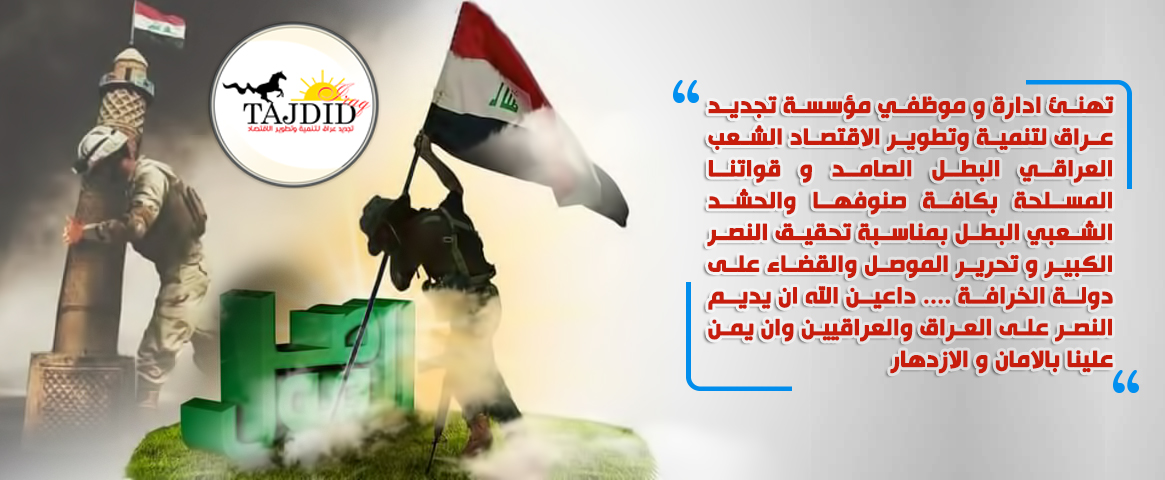 تهنئ ادارة و موظفي مؤسسة تجديد عراق لتنمية وتطوير الاقتصاد الشعب العراقي البطل الصامد و قواتنا المسلحة بكافة صنوفها والحشد الشعبي البطل بمناسبة تحقيق النصر الكبير و تحرير الموصل والقضاء على دولة الخرافة …. داعين الله ان يديم النصر على العراق والعراقيين وان يمن علينا بالامان و الازدهار