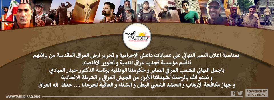 بمناسبة اعلان النصر النهائي على عصابات داعش الاجرامية و تحرير ارض العراق المقدسة من براثنهم